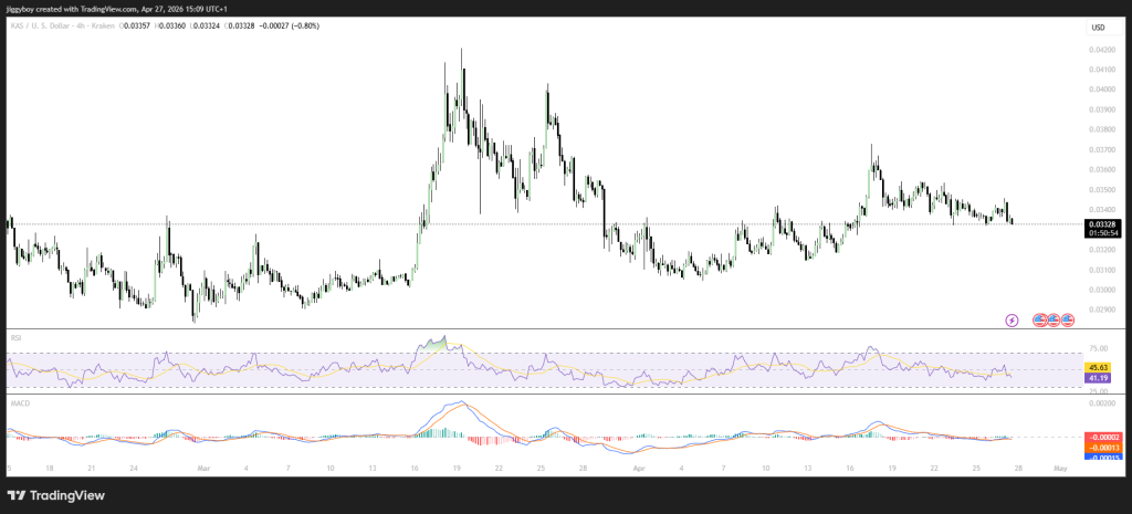 观察图表可见,价格走势持续在一个宽幅震荡结构中运行。在3月中旬一轮强势上涨将KAS价格推高至0.040美元上方后,价格回撤并稳定在0.031至0.036美元区间内。