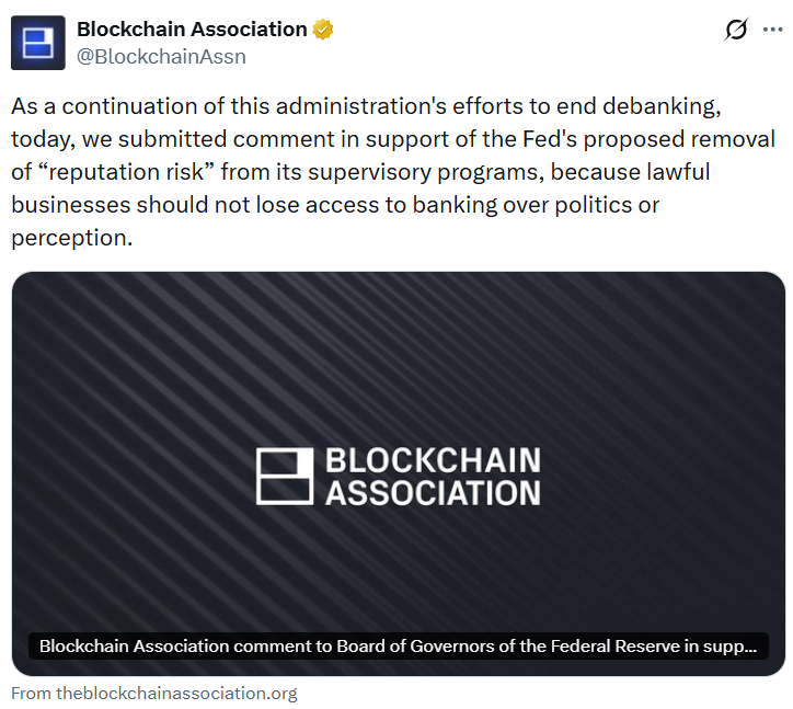 美国加密货币游说团体区块链协会日前表态,支持美国联邦储备委员会的一项提议,即将“声誉风险”因素从其对银行的监管中正式移除。此前,“声誉风险”曾被用作切断加密货币公司银行服务的理由。
