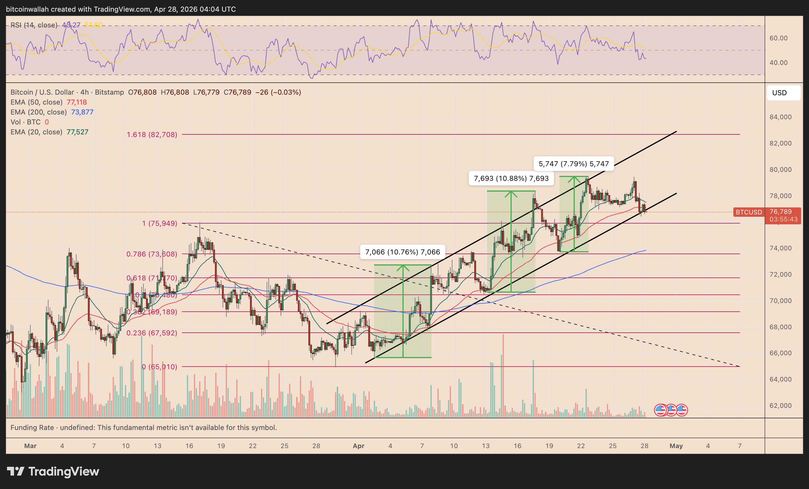 目前比特币正在76,800美元至77,500美元附近的通道下沿支撑区域盘整,该区域亦与4小时图上20周期(绿色)及50周期(红色)指数移动平均线重合,构成上行趋势中的动态关键支撑。若自此区域反弹,比特币价格有望上行至通道上轨约82,700美元附近,较现价潜在涨幅约7.70%,该位置同时对应1.618斐波那契回撤位。