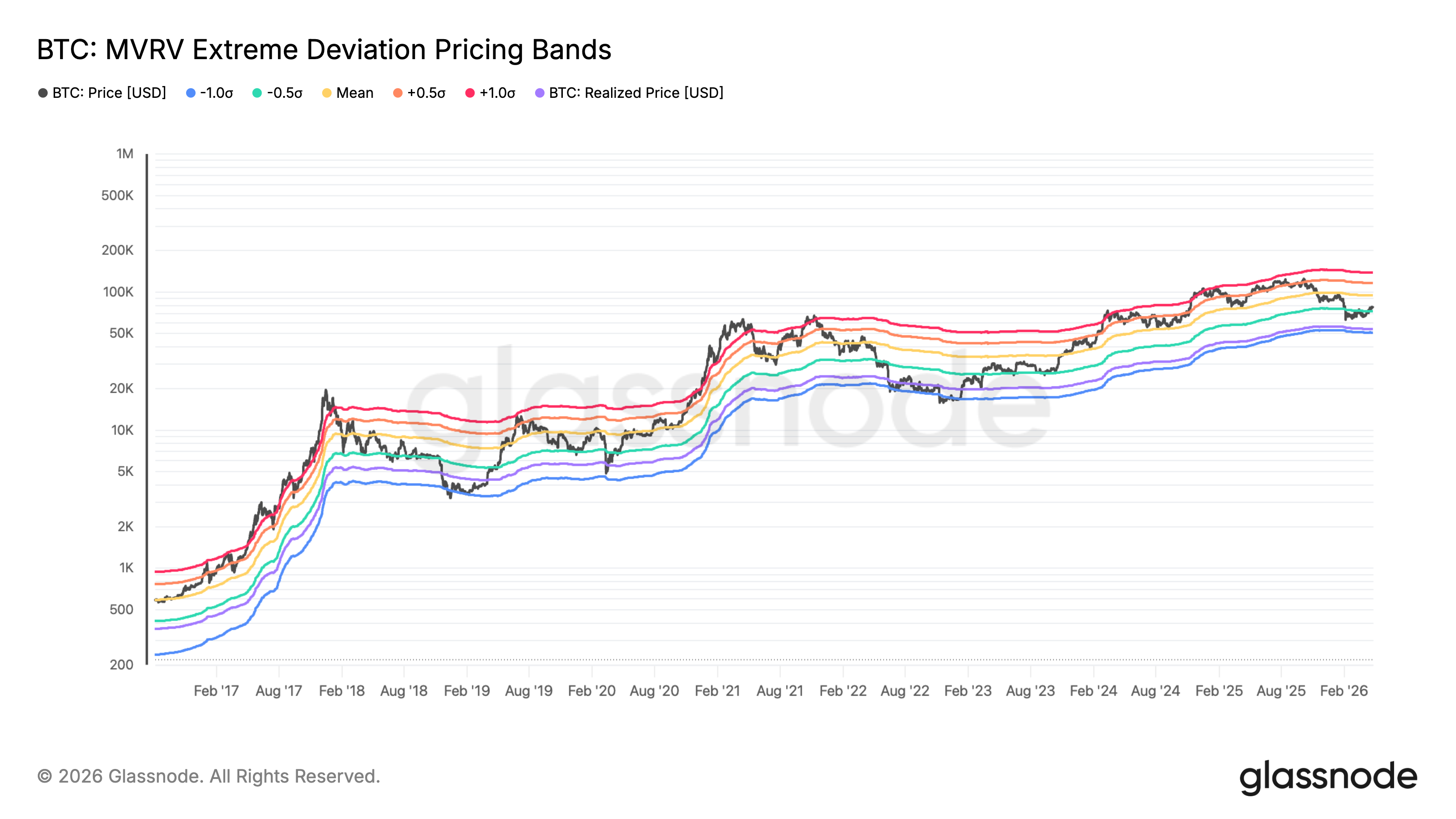 比特币近期的反弹使其价格重回MVRV(市值/已实现价值)的-0.5标准差带(绿色带,约72,750美元)上方。该指标带在过往周期中多次承担支撑与阻力的角色,用于衡量比特币现货价格偏离投资者整体链上成本基础的程度。