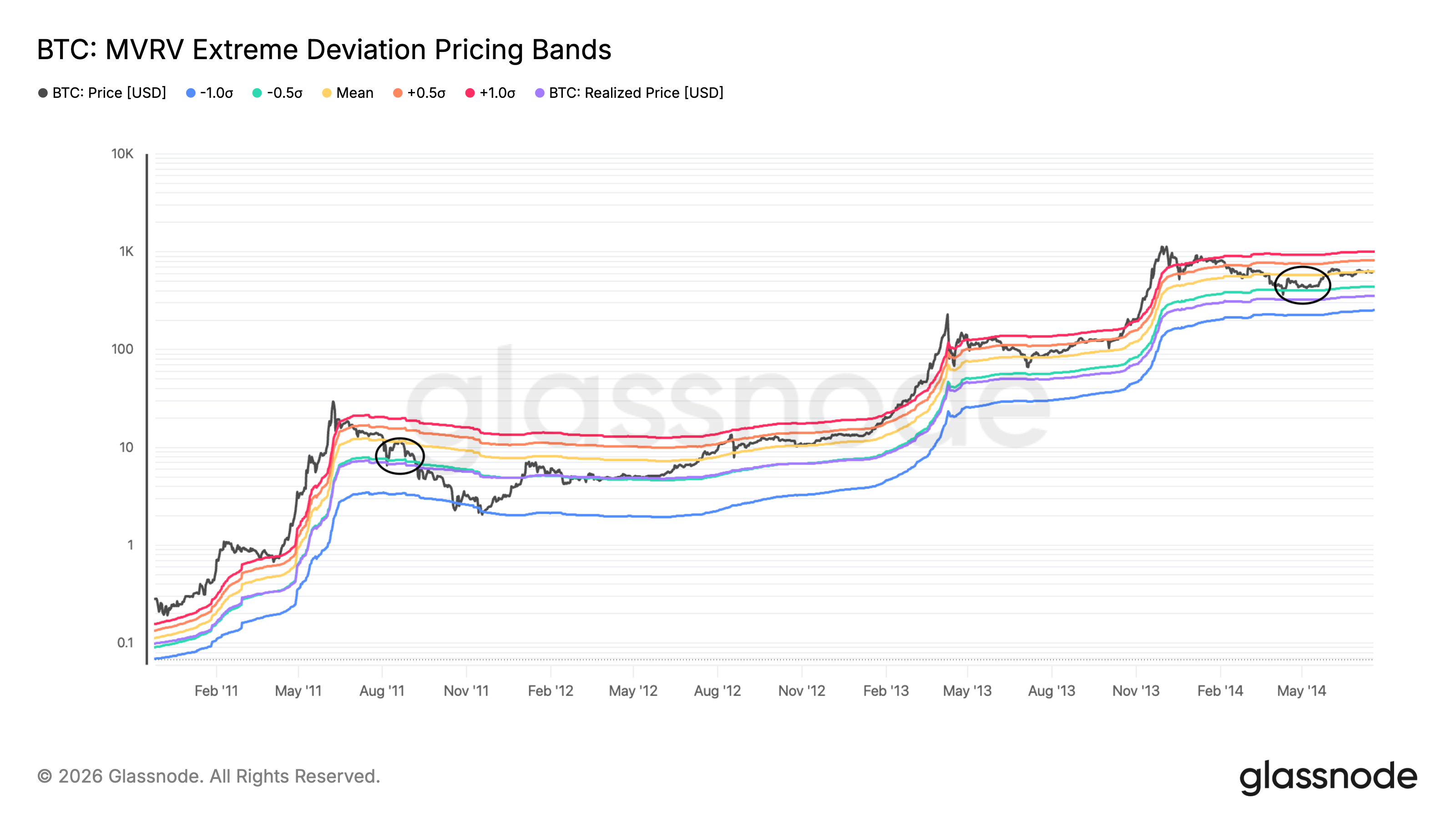 当比特币价格重新站上较低标准差带时,意味着市场不再深度低于其已实现价值交易,常为价格向上一个标准差带运动打开空间。历史数据显示,在包括2014年及2018年熊市在内的下跌行情中,比特币重新站稳绿色带作为支撑后,往往出现向均值带(黄色带)的短期反弹。