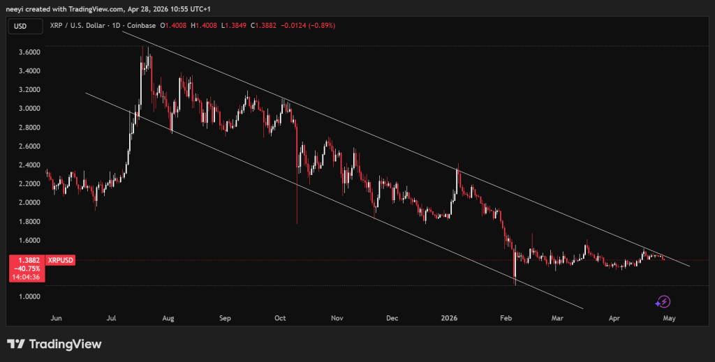 仔细审视XRP的整体结构,便可理解为何5美元目标仍需耐心。自2025年7月以来,价格一直在下降通道内交易,这种形态通常指向受控的下跌趋势,除非发生突破。