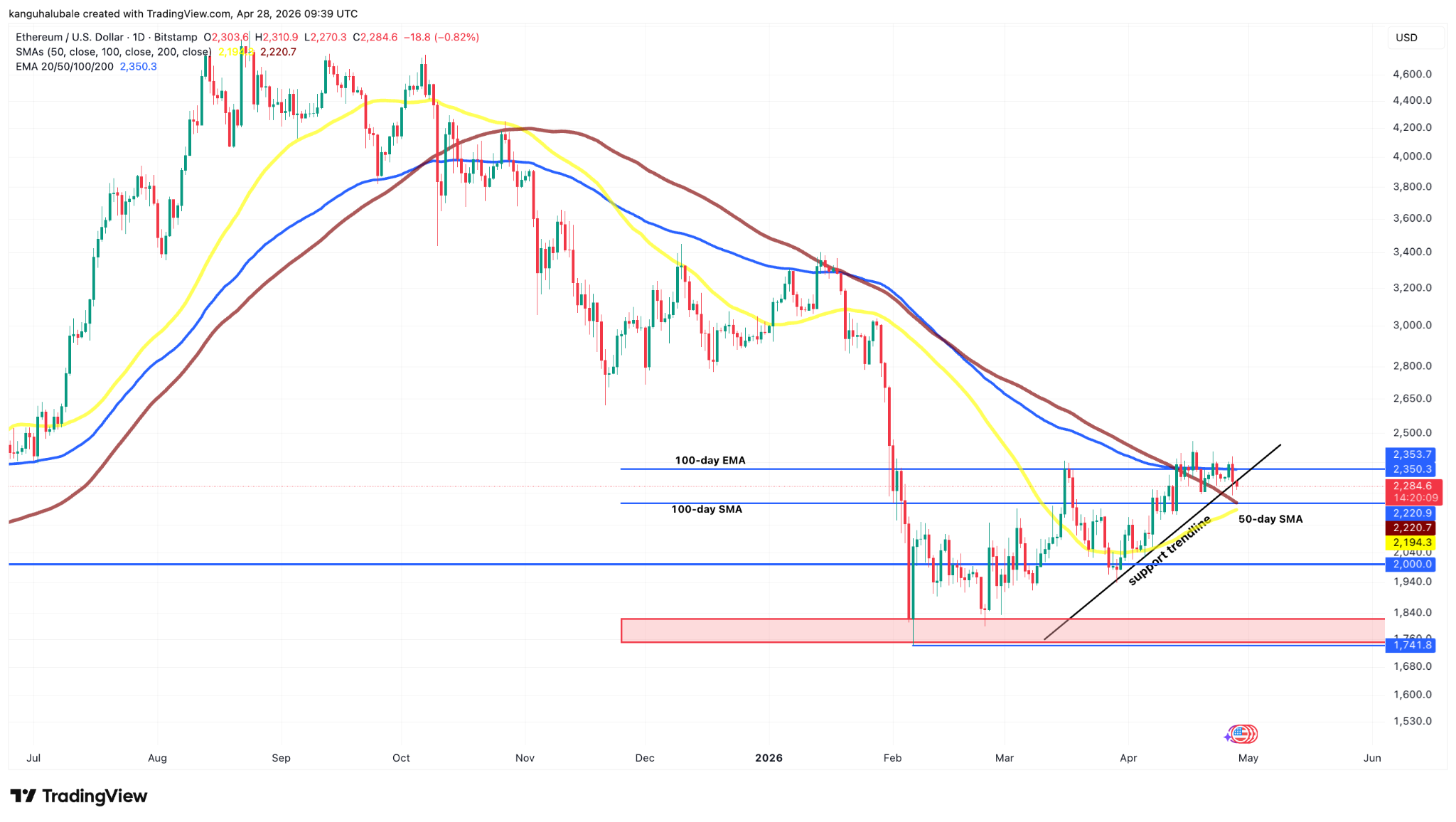 TradingView数据显示,ETH/USD交易对已跌破2300美元,过去两日下跌5%,完全回吐周末全部涨幅。这意味着价格仍夹在2350美元的100日指数移动平均线与2220美元的100日简单移动平均线之间,如下图所示。