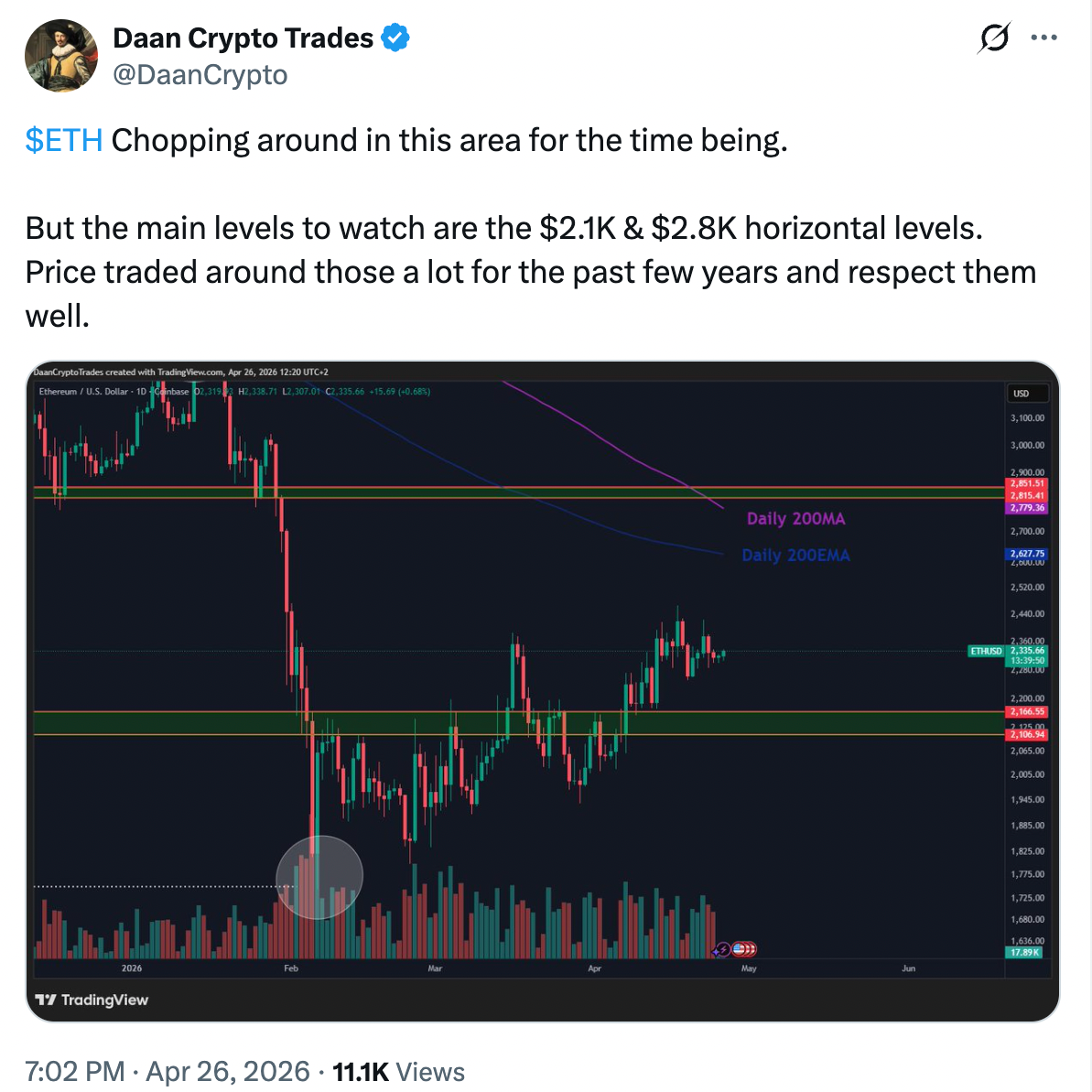 交易员Daan Crypto Trades近期在社交媒体分析称,需重点关注2100美元支撑位与2800美元阻力位,过去数年ETH价格始终“严格遵循”该阻力区间。