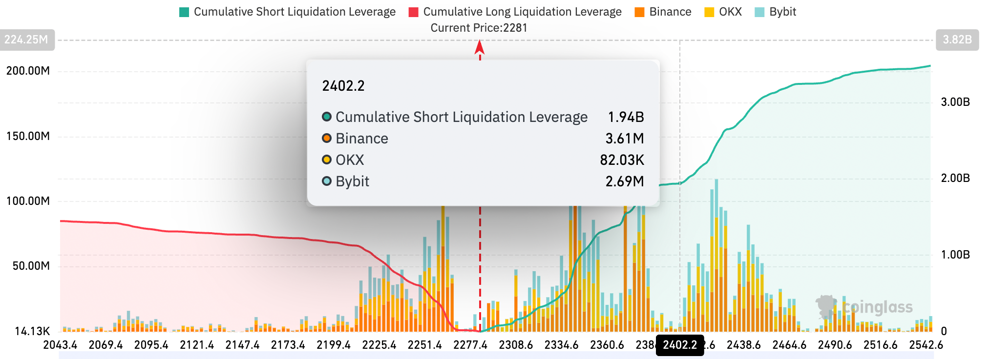 与此同时,以太坊爆仓分布图显示:若突破2400美元,将在全交易所触发超19.4亿美元的空头仓位强平。