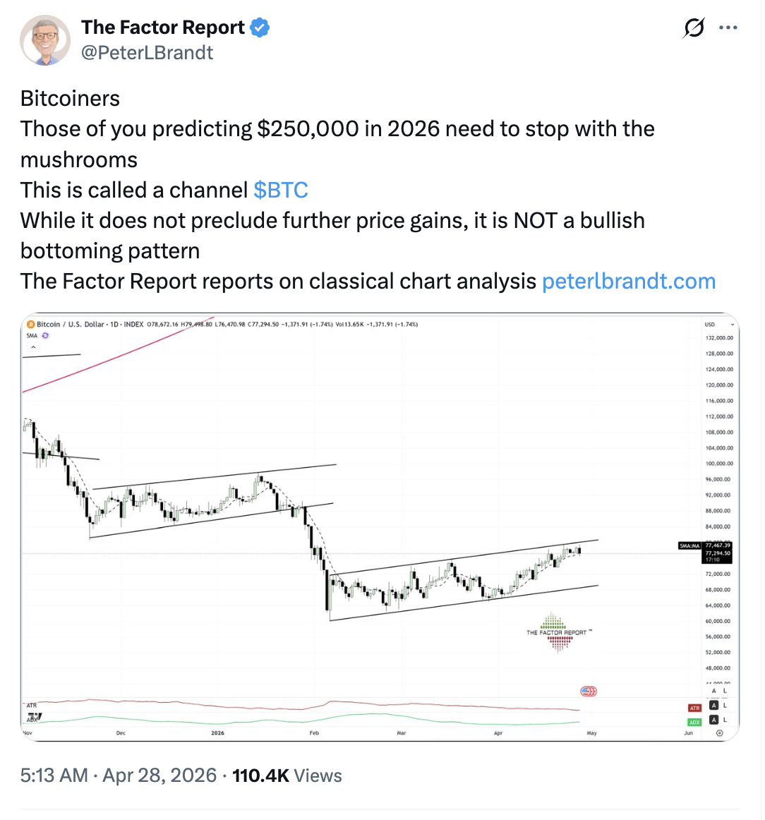 期货市场资深交易员彼得·勃兰特指出,比特币日线图上正在形成一个成熟的看跌旗形通道,这可能使比特币在今年升至250,000美元的几率保持低位。截至周二,比特币在测试了接近79,500美元的旗形上边界阻力后,已显示出回撤迹象。若此次回调持续,到五月,加密货币可能跌向旗形下边界约69,000美元的水平。