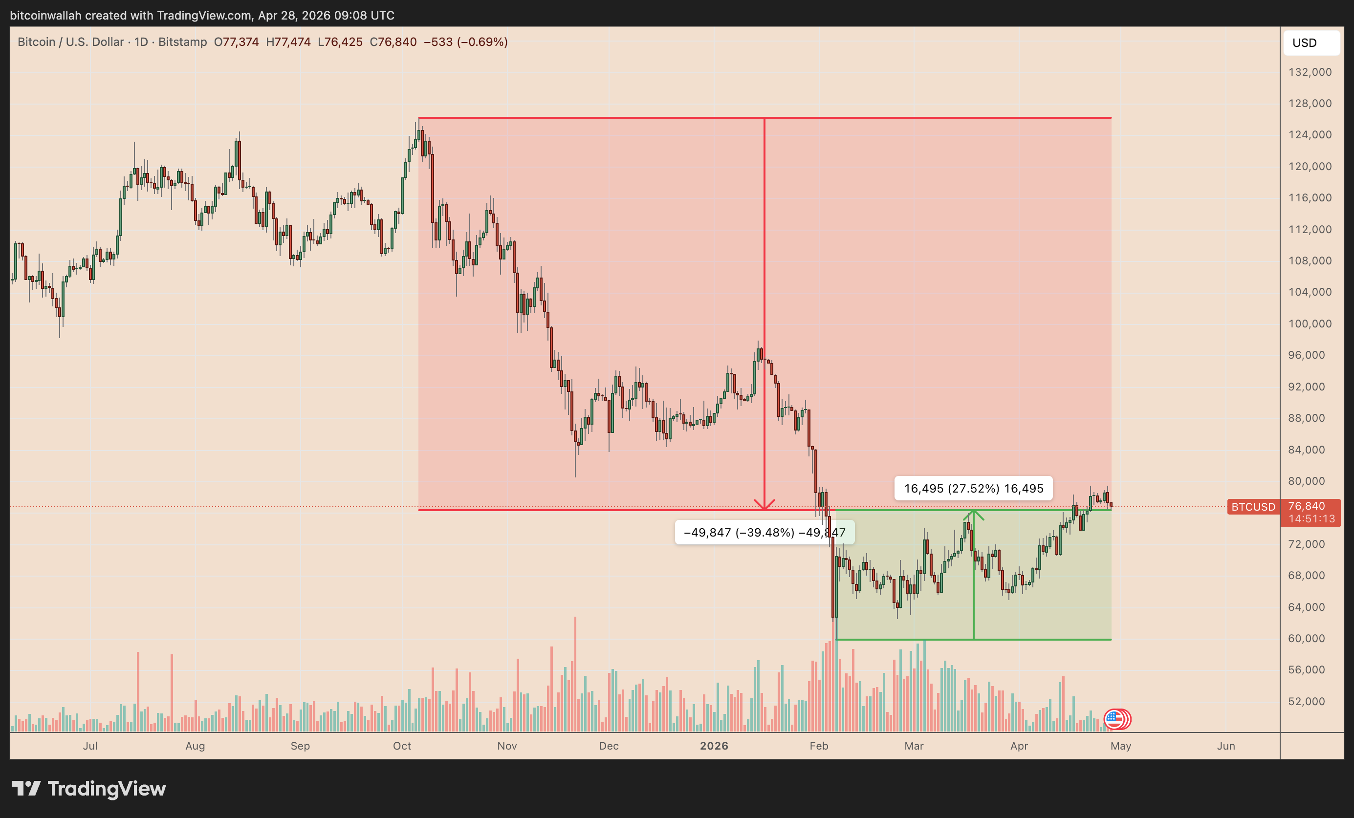 尽管持续复苏,比特币的交易价格仍比2025年10月接近126,000美元的历史高点低约40%。