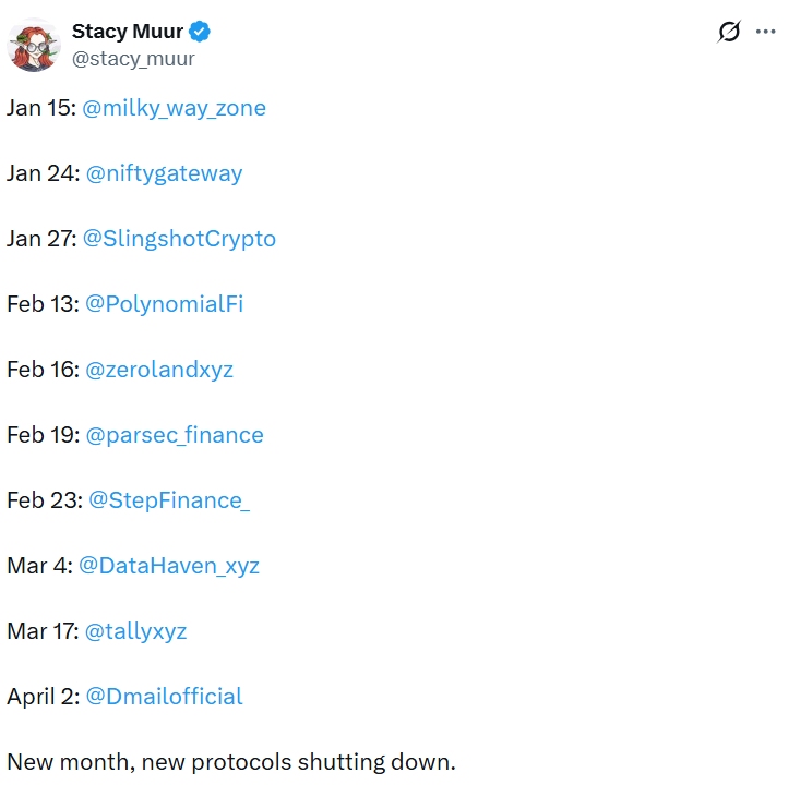 四月亦不例外。去中心化邮件服务Dmail宣布即将关闭,原因包括基础设施成本高昂、筹资失败及代币实用性不足。加密控股公司Echo Base首席执行官兼重组顾问罗山·达利亚向Cointelegraph表示:“在以往的市场周期中,项目可通过增发代币或风险投资支持来延长运营周期。而如今这条路基本已被阻断,亏损更早被确认,项目往往走向清算而非复苏。”加密货币通过代币构建了快速的融资渠道,却仍缺乏在问题发生时进行清算的框架,一旦情况恶化,便难以重组债权或协调各方利益关系。
