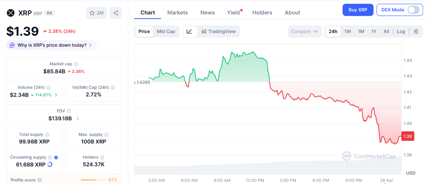根据CoinMarketCap数据,截至4月27日,瑞波币交易价格为1.39美元,在1.39美元支撑位上方的对称三角形内盘整。《CLARITY法案》是区分平淡之年与突破行情的唯一催化剂,4月23日有120家公司要求参议院进行投票。