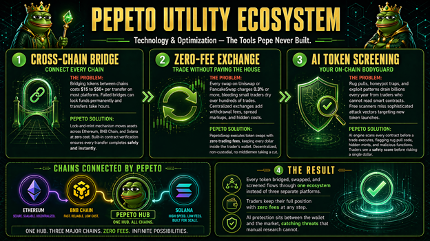 Pepeto交易所上的每个合约在建立连接前都会经过完整的代码扫描,在资金面临风险前标记危险。在PepetoSwap上,跨以太坊、BNB链和Solana的交易成本为零,且这三个网络间的跨链转账完全免费。该预售已筹集超过960万美元,SolidProof已完成对所有合约的全面审计,每日复利年化收益率177%自动运行,上市推广由一位此前在币安任职的高管领导。