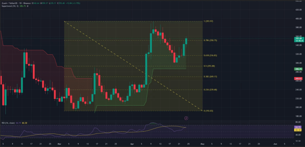 技术面上,Zcash从293美元附近的50%斐波那契回撤位反弹,确认了市场强度。价格目前正在测试350美元区域的阻力位,该位置与78.6%回撤位形成共振。