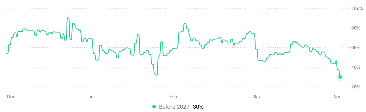 交易者目前对《清晰法案》获得批准的预期概率定价较低。这项加密市场结构法案于2025年7月在众议院获得通过,但此后在参议院银行委员会陷入停滞。