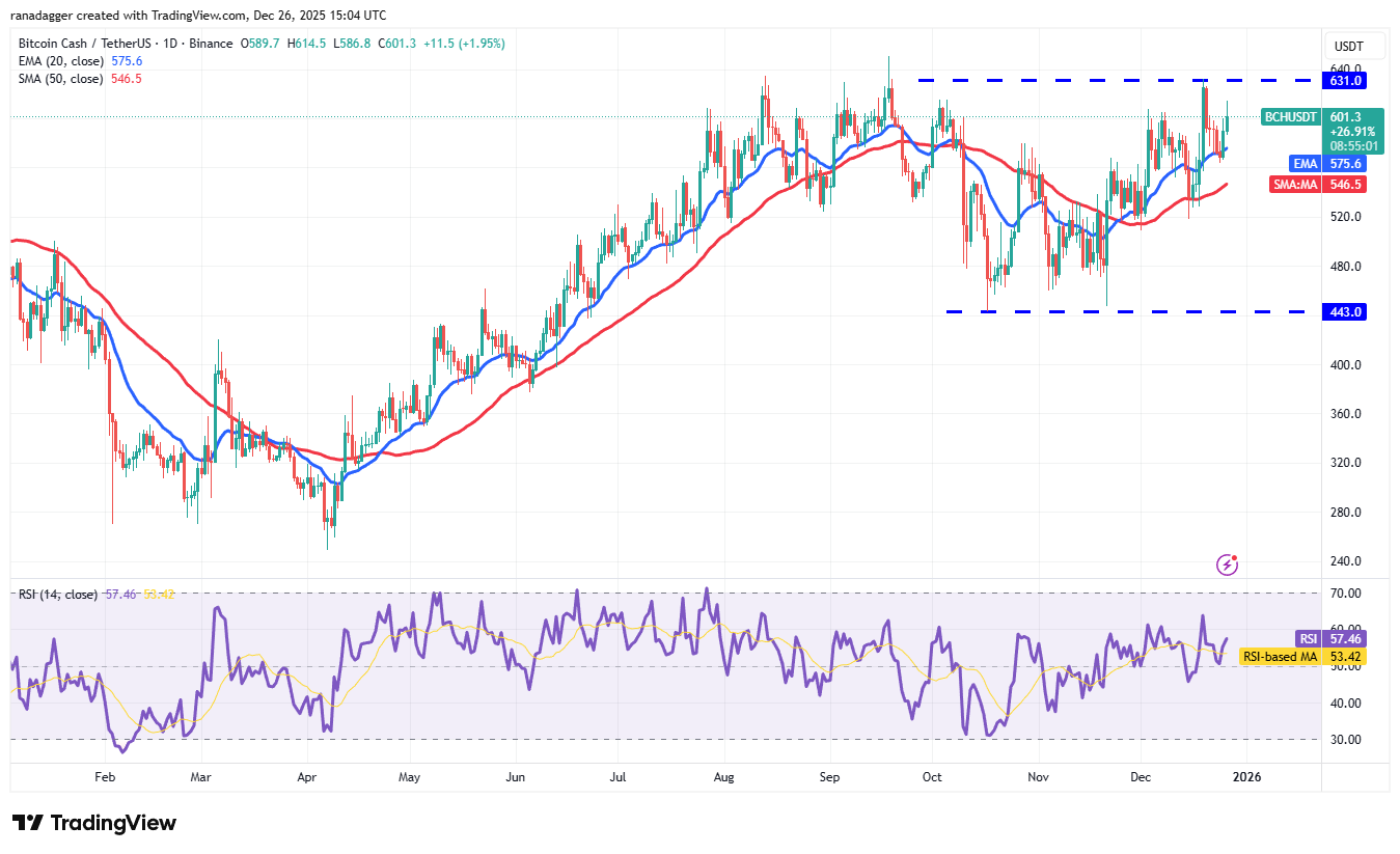 比特币现金周四从20日EMA(575美元)反弹,显示市场情绪转暖。