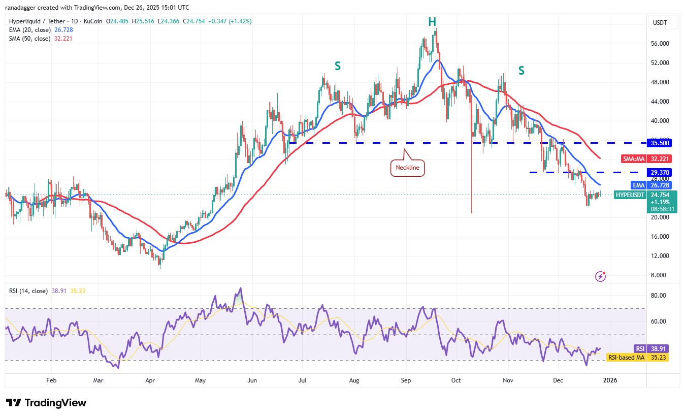 Hyperliquid仍处于20日EMA(26.72美元)下方,但空头未能将价格压制在22.19美元支撑位之下。
