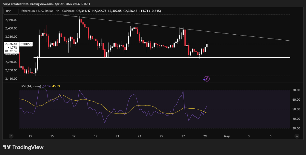 自四月中旬以来,以太坊价格一直处于一条下降趋势线下方,该结构持续限制其上涨。价格已多次从2250美元至2270美元的支撑区域反弹,每次反弹都将ETH带回到同一阻力区域附近。