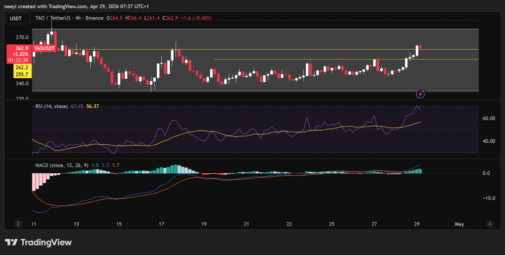 只要262美元支撑位保持,Bittensor价格就保持看涨倾向。该支撑可能允许价格在今日交易时段向275美元移动。