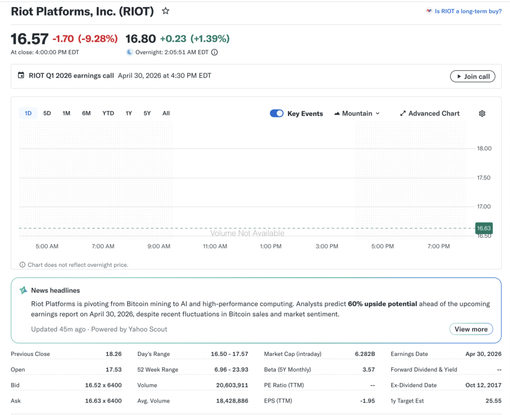 Riot Platforms 在“2026年4月加密货币股票飙升”期间录得近30%的涨幅,从11美元涨至16.65美元,并一度触及18.61美元。公司报告称第一季度生产了1,473枚BTC,并持有15,680枚BTC,巩固了其强大的挖矿版图。凭借42.5 EH/s的部署算力,Riot持续积极扩张规模,在“2026年4月加密货币股票飙升”周期中确立了其关键参与者的地位。