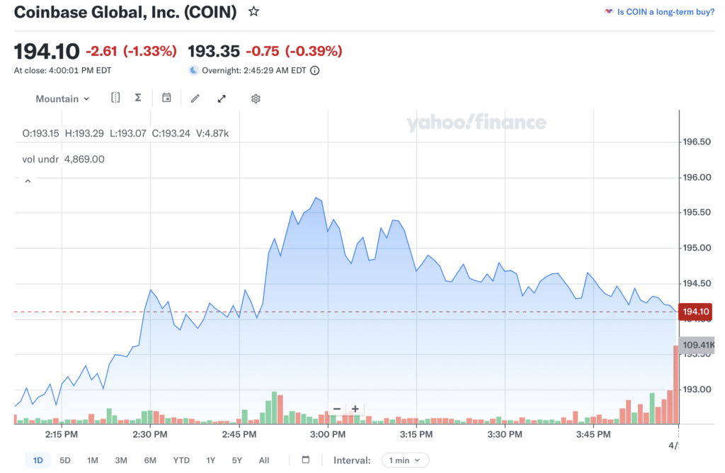 Coinbase 在“2026年4月加密货币股票飙升”期间上涨了约20%,从172.99美元升至210美元以上的峰值,随后稳定在194美元附近。随着比特币攀升,交易量上升和零售参与度恢复使交易所受益。与矿商不同,Coinbase反映了更广泛的交易活动,使其在“2026年4月加密货币股票飙升”趋势中呈现出不同的风险敞口特征。