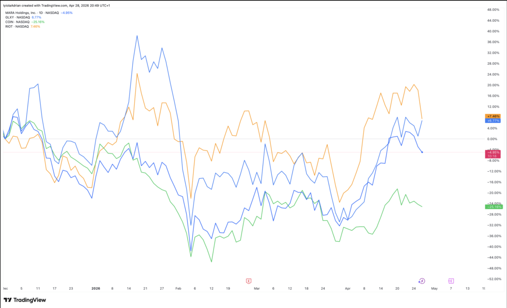 “2026年4月加密货币股票飙升”揭示了加密货币股票之间明显的分化。Galaxy因基础设施敞口而领先,MARA和Riot受益于挖矿杠杆,而Coinbase的涨幅则较为温和。这表明“2026年4月加密货币股票飙升”环境正趋于成熟,投资者不再将加密货币股票视为单一的交易标的。