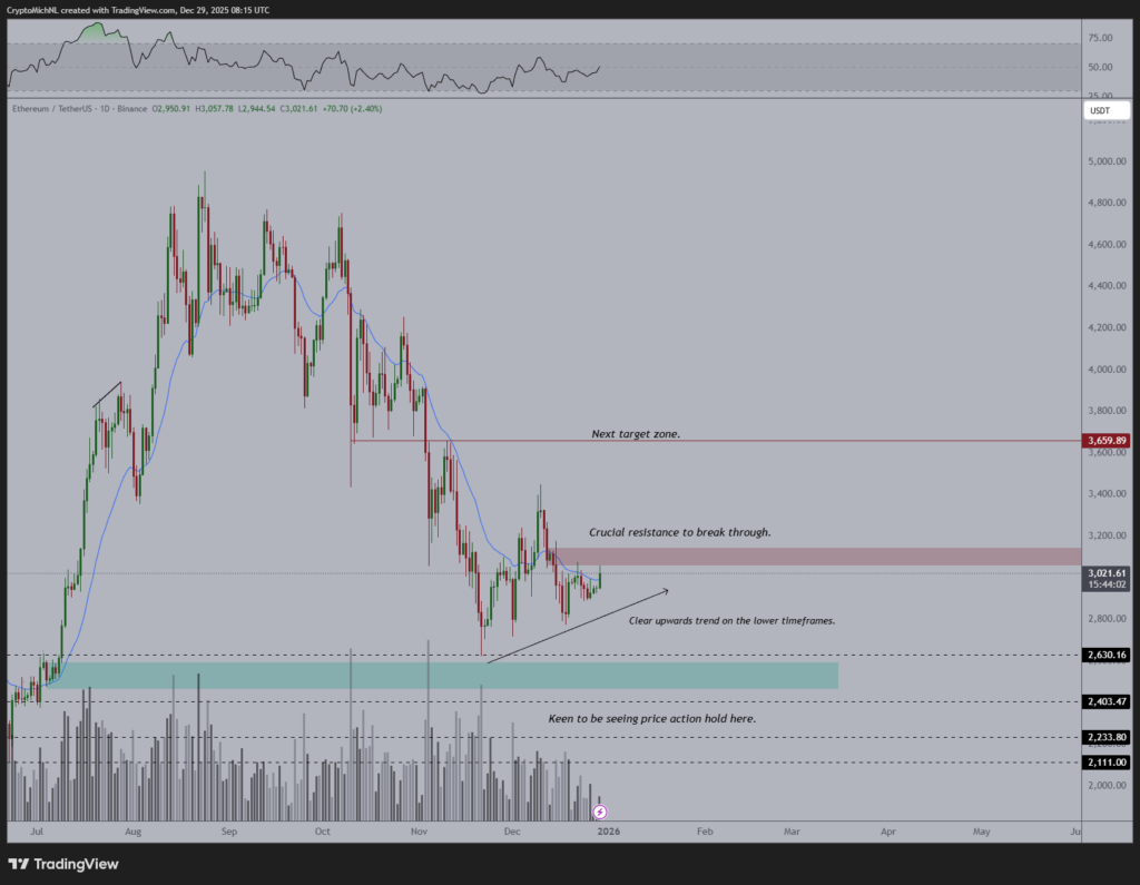撰稿时以太坊交易价格为2,926美元,24小时波动区间为2,908.75-3,051.94美元。交易量在24小时内激增200%,显示市场关注度提升。知名分析师Michael van de Poppe认为ETH即将突破上行,需攻克3,050-3,150美元阻力区才能积聚上涨动能,预计有望冲击3,700美元。