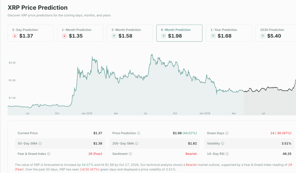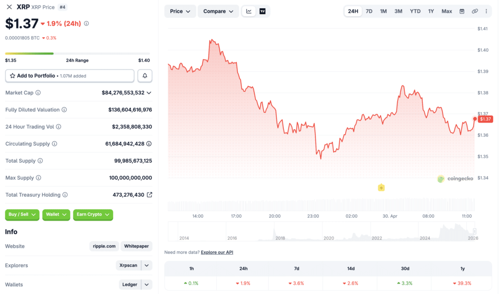 这种双重动态给XRP价格方向带来了不确定性。XRP当前实时价格为1.36美元,市值约为840.1亿美元,尽管面临短期波动压力,但反映了每日略有下跌而宏观层面兴趣持续的局面。