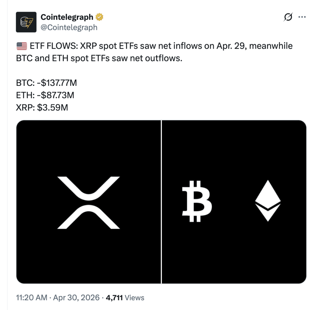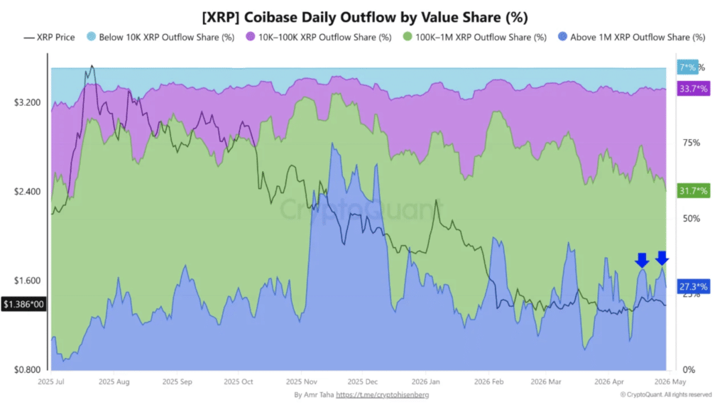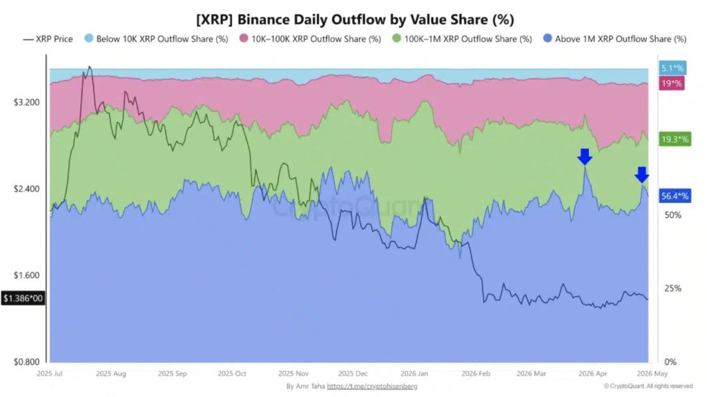 2026年XRP价格分析的一个关键焦点是各大交易所XRP巨鲸活动的剧烈转变。数据显示,在4月26日,转移超过100万XRP的钱包占币安资金流出量的近60%,这一水平接近3月的峰值。这强化了XRP巨鲸外流主导交易所资金流动动态的观点,减少了可用的现货供应。