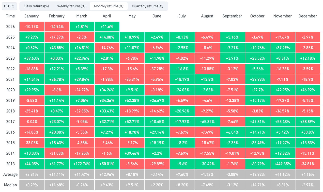 截至撰稿时,四月月线收盘预计将带来11.6%的涨幅——根据数据统计,这仍是比特币近一年来的最佳月度表现。