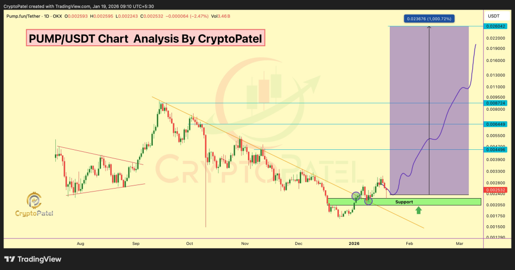 Crypto Patel 强调,PUMP 价格保持在 0.0020 美元上方,使得看涨倾向保持完好。图表支持这一观点,因为价格已收复了此前作为阻力的支撑位。这类收复往往预示着买家愿意比以往更早地介入。