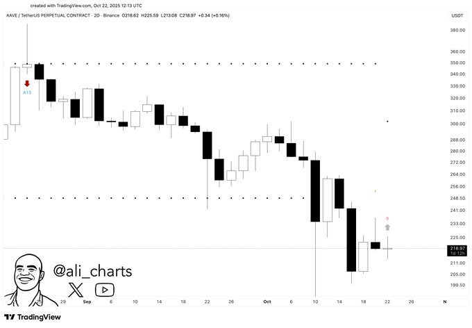 分析师Ali(@ali_charts)分享的图表显示,Aave(AAVE/USDT)在两天时间框架内出现TD序列买入信号。这种技术形态表明看跌动能可能已进入最后阶段,市场情绪正转向复苏。该TD9模式是在连续多根看跌烛台后形成的,这种结构通常预示着数字资产的短期反转。