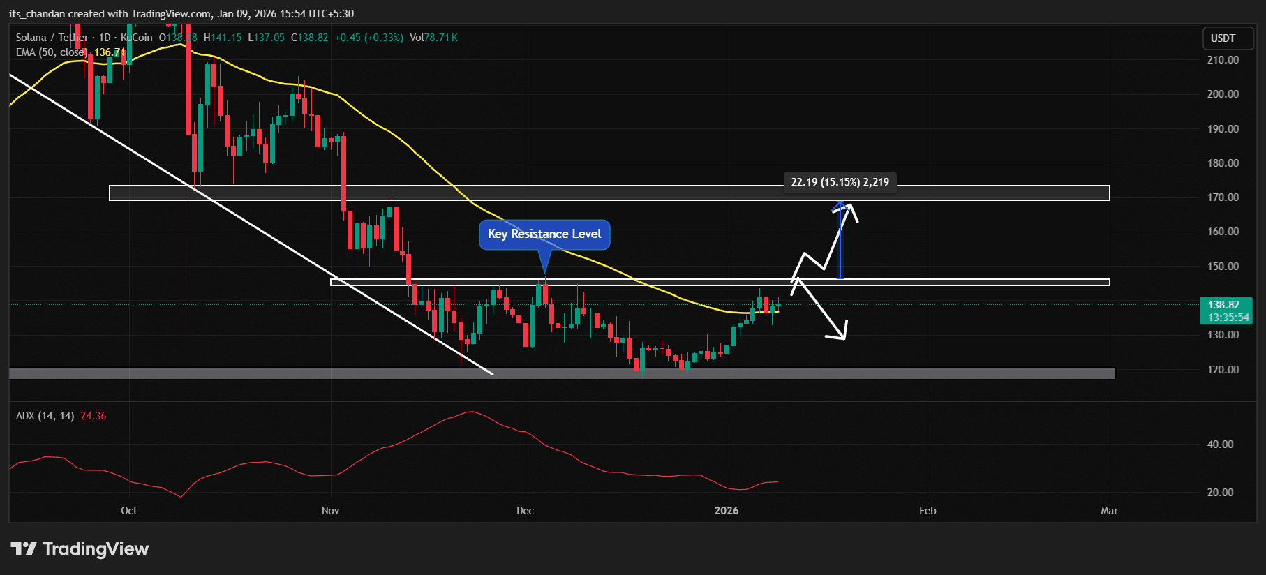 SOL价格目前徘徊在约136美元水平,过去24小时内下跌超过2%。Solana远非市场上最活跃的区块链,但其最近的价格行为显示出犹豫不决的态势。分析师认为,SOL价格在突破约143美元的主要阻力区间方面表现不佳。若日收盘价能稳定站上146美元,则可能使其走向168美元;在此之前,上行前景尚不明朗。