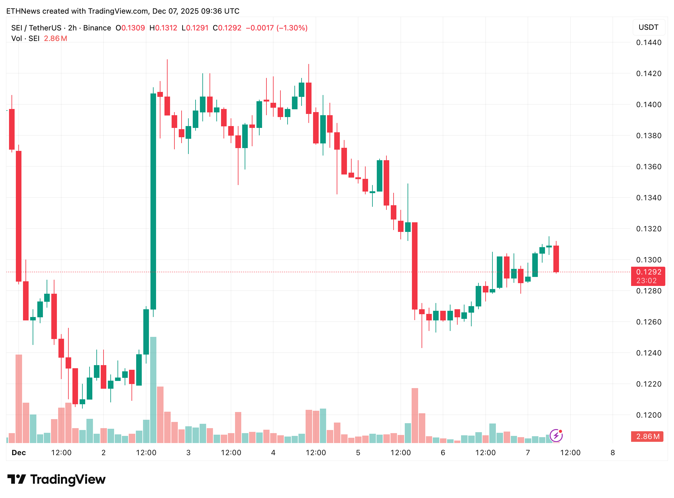 短期图表更清晰地展现了价格行为。从0.138-0.140美元下跌至0.125美元区域后,SEI开始构筑小型反弹结构。