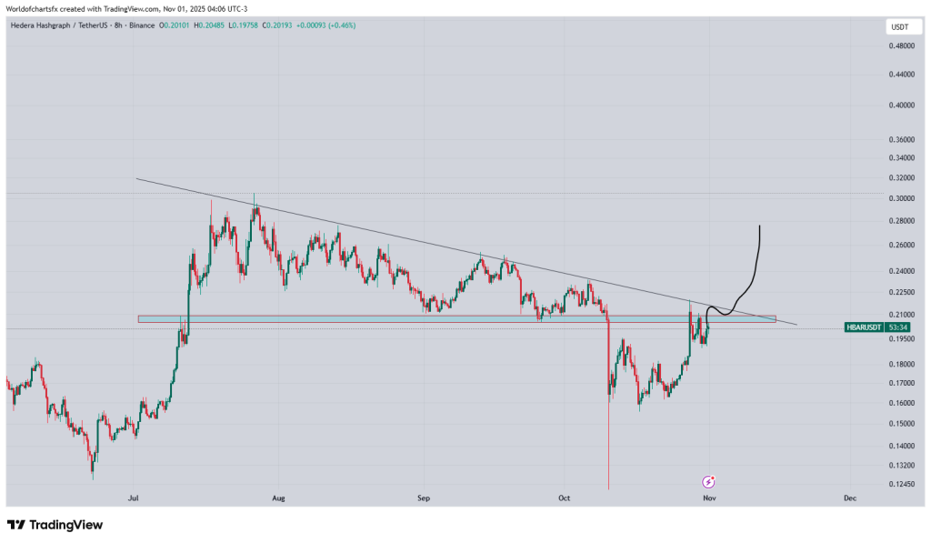 目前HBAR价格正直接测试下降通道上轨——该趋势线自七月以来已多次压制反弹。0.21美元关口至关重要,若买家能将其转化为支撑位,HBAR技术图形将完全打开。