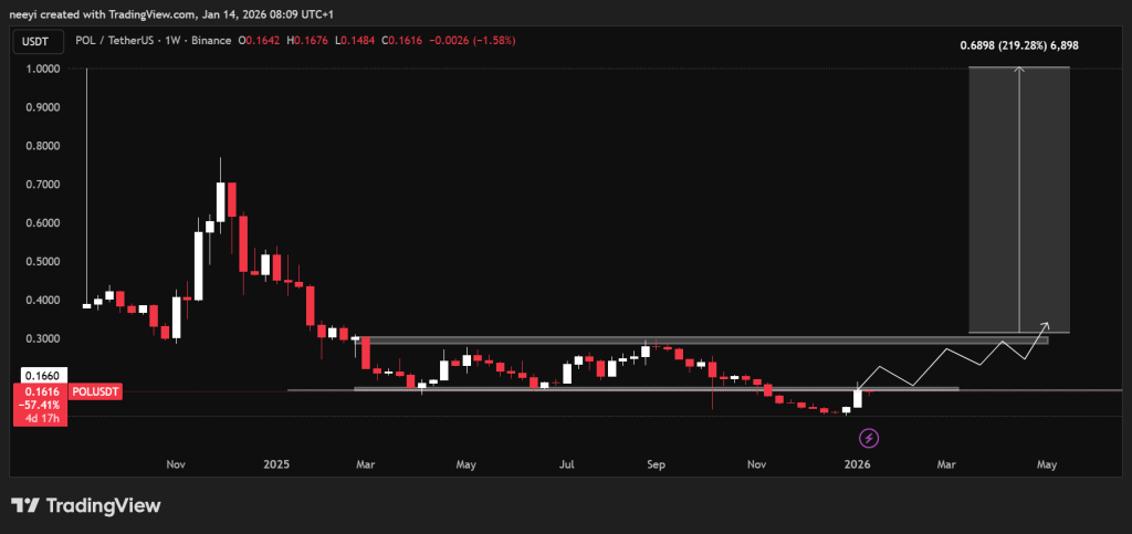 自2025年2月以来,Polygon价格一直在0.3美元的阻力位下方交易。价格滑入该区域并在近一年内未能重新站上,使该水平成为一个重要的心理障碍。2025年11月情况恶化,当时POL价格跌破约0.16美元的支撑位。