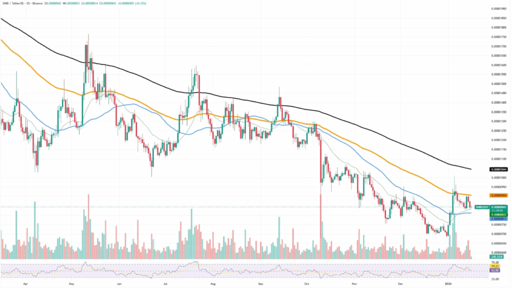 关键技术阻力位持续压制价格回升,表明短期市场缺乏持续的买方动能。SHIB/USDT图表显示资产价格仍处于关键移动均线下方,短期反弹未能突破阻力区域,当前形态更倾向于盘整而非主动积累。