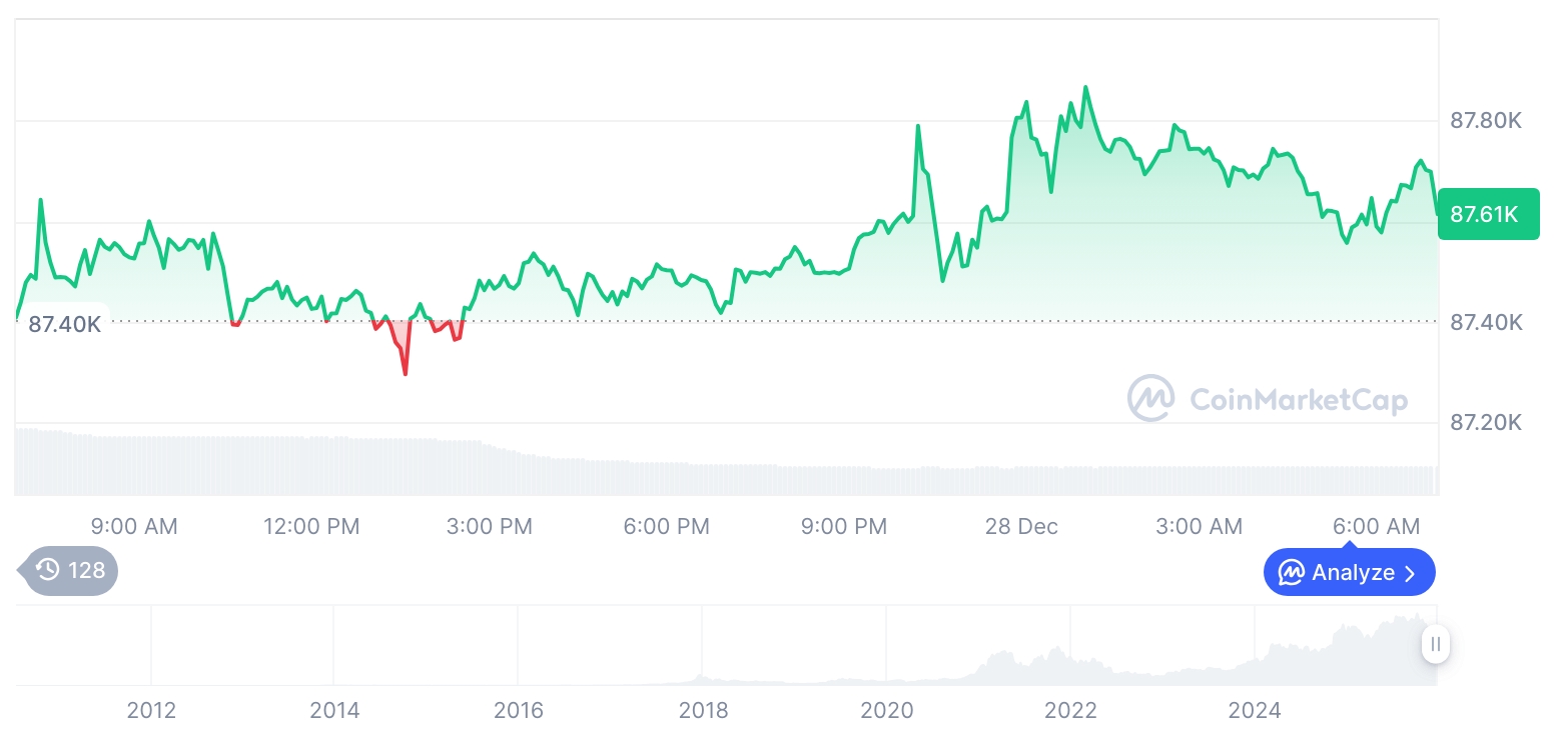 2025年12月27日,比特币价格达到87000美元,当日交易量为306亿美元,年内累计跌幅达6.8%。当前高价既蕴含买入机遇,也折射出市场持续的不稳定性,这些因素正影响着投资者情绪与未来交易策略。