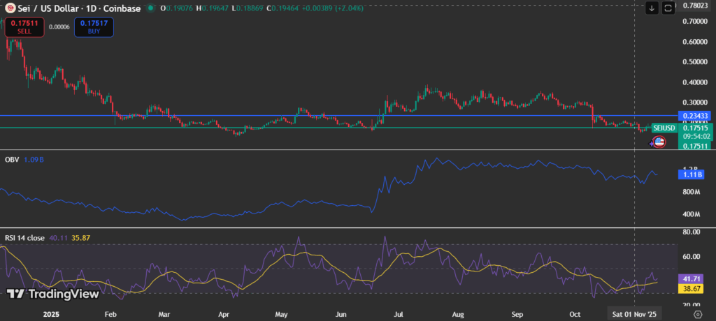 分析师指出多项技术指标显示SEI即将结束盘整阶段,目标价位看向0.22-0.26美元区间。自2025年中旬以来,SEI价格始终稳固维持在0.17美元强支撑位上方。相对强弱指数(RSI)从35回升至41,表明看跌动能正在减弱。若RSI突破50关口,或将确认看涨趋势增强。