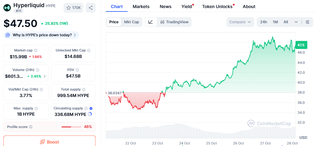 HYPE价格过去七日暴涨25%,成为本周表现最佳资产之一。据CoinMarketCap数据,该DeFi代币年内涨幅达78%,远超多数头部山寨币。