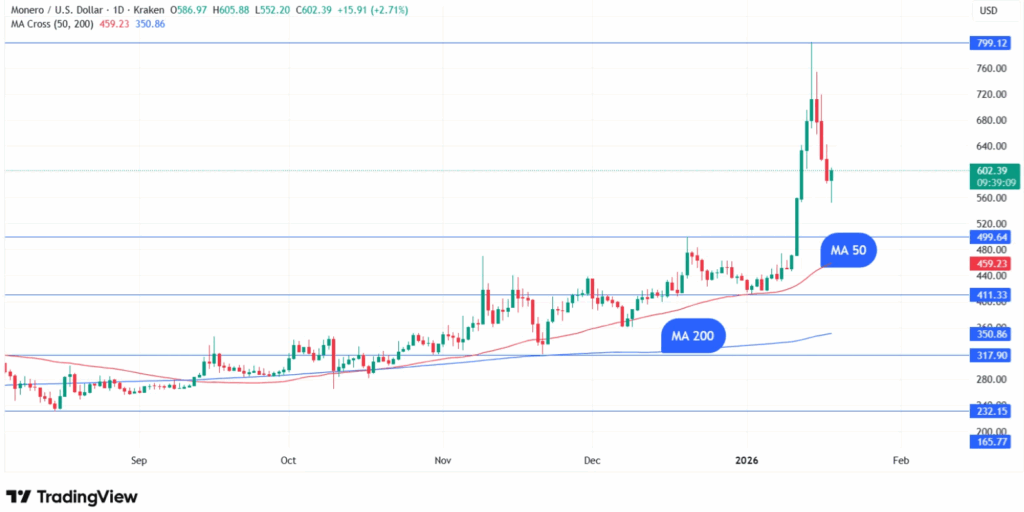 尽管门罗币较峰值下跌26%,但仍处于关键技术支撑位上方。截至报告时,门罗币交易价格为590美元,过去24小时下跌5.98%,但周涨幅仍保持19%。该代币持续交易于50日移动均线及200日移动均线上方,二者分别位于349美元与455美元。这些价位在去年11月形成重大金叉形态后已转化为支撑,表明看涨动能依然存在。