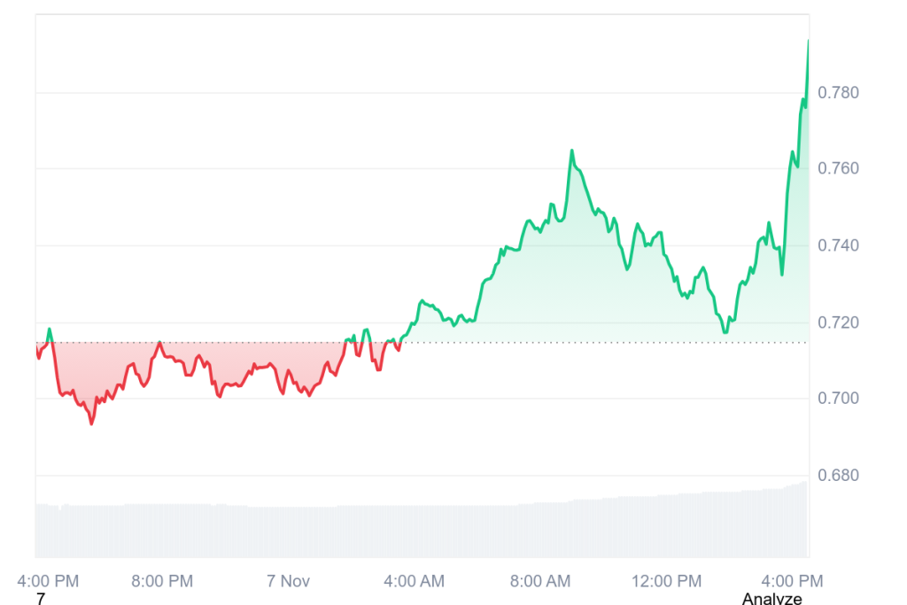 从技术指标看,WLD尚未企稳。其价格跌破与20日均线重合的0.75美元支撑位——该位曾被许多交易者视为短期强弱分界线。MACD柱状图仍显示-0.0036的负值,7日RSI徘徊在30的超卖区间边缘。虽然该区域常出现技术性反弹,但当前尚未出现看涨背离信号,表明卖方仍主导市场。