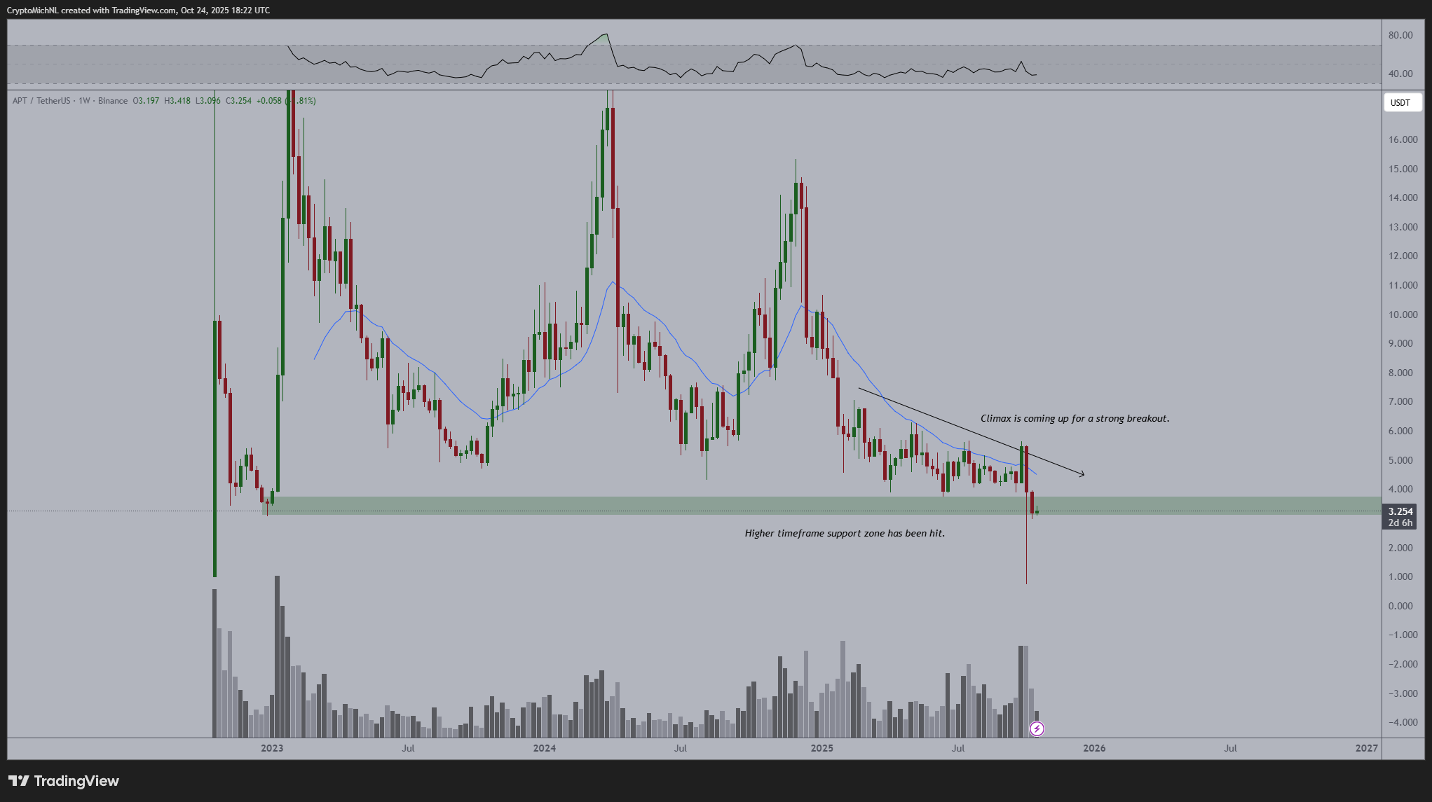 2023年1月30日,APT代币曾触及19.9美元的历史高点。然而截至2025年10月11日(约两周前),其价格已回落至2.2美元的新低。虽然近期出现47%的反弹,但整体表现仍显疲软。