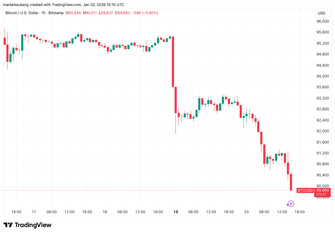 关键要点:美国市场首次对欧盟格陵兰贸易战做出反应,比特币面临9万美元价格支撑线考验;黄金与白银持续刷新历史高位,股市则陷入恐慌;有知名交易员指出,若当前支撑位保持稳固,比特币仍有望重返10万美元关口。