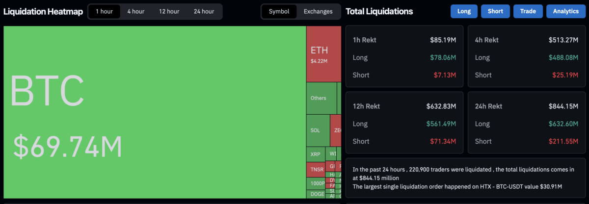 过去24小时内加密货币市场爆仓金额接近8.44亿美元,波及超过222,000名交易者。
