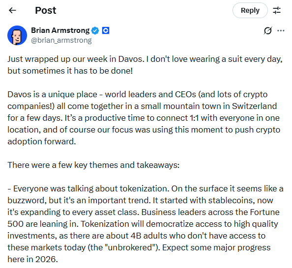 阿姆斯特朗表示,代币化是此次论坛讨论的主导话题。他将其描述为一种超越稳定币,正向股权、信贷和现实世界资产扩展的趋势。