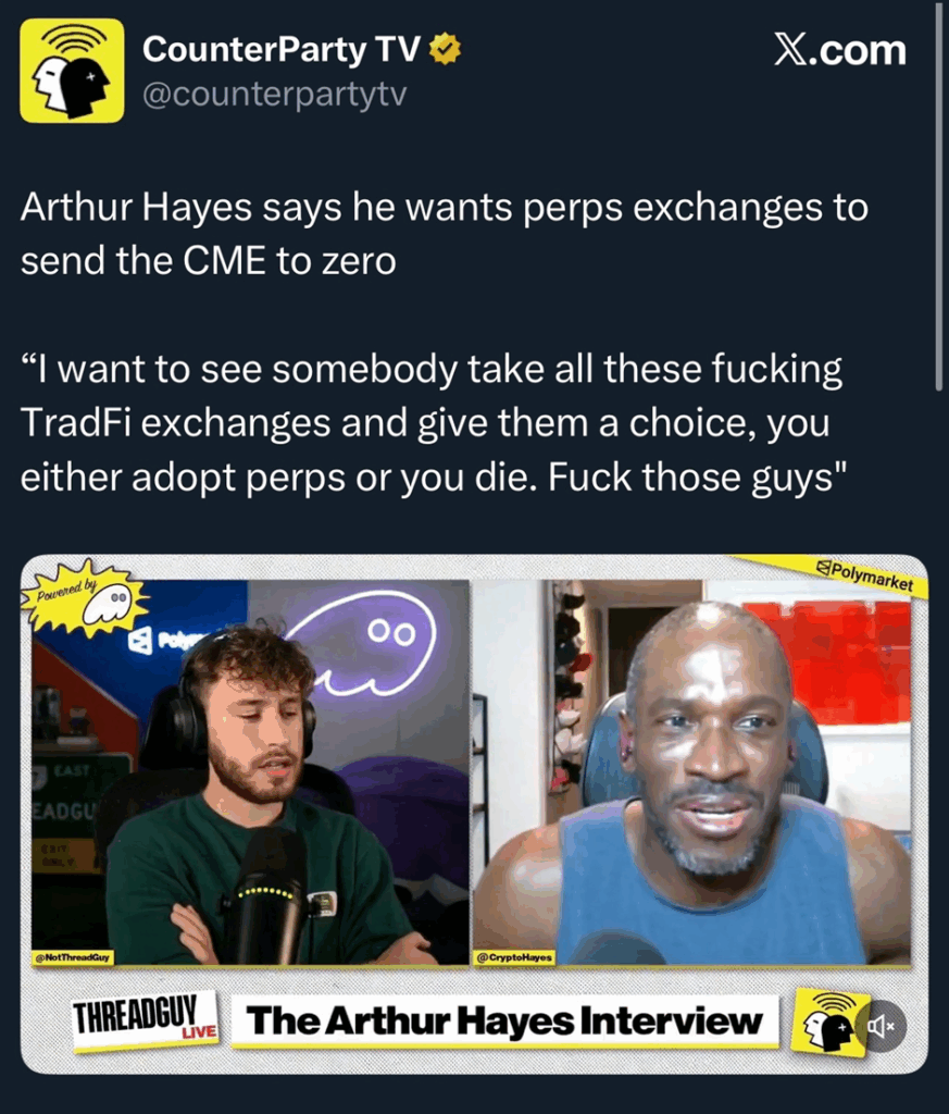 知名交易员Arthur Hayes对此现象提出独到见解——他认为根本原因在于加密货币同时运行着两套不兼容的期货体系: