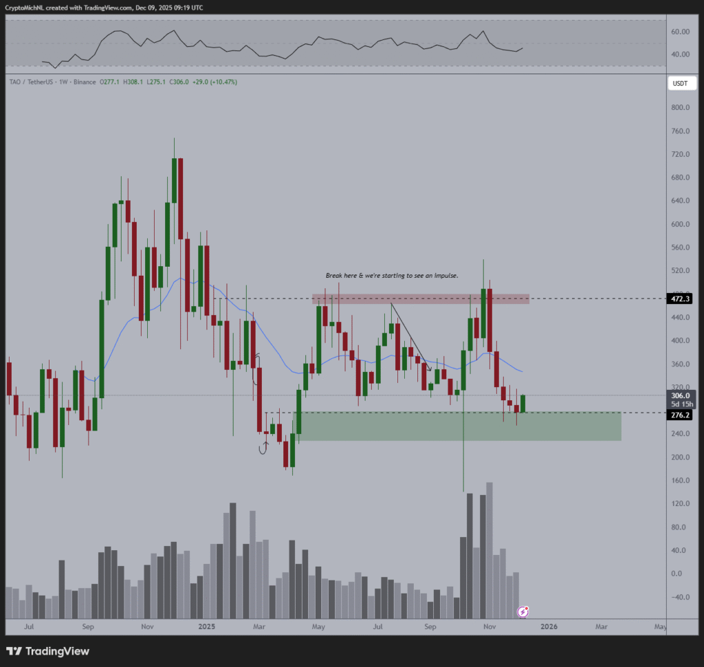 TAO图表显示潜在看涨突破迹象。尽管面临整体市场波动,$TAO仍展现出韧性,许多人认为减半事件将推动进一步增长。Van de Poppe的信心源于技术形态和$TAO不断扩展的生态系统。