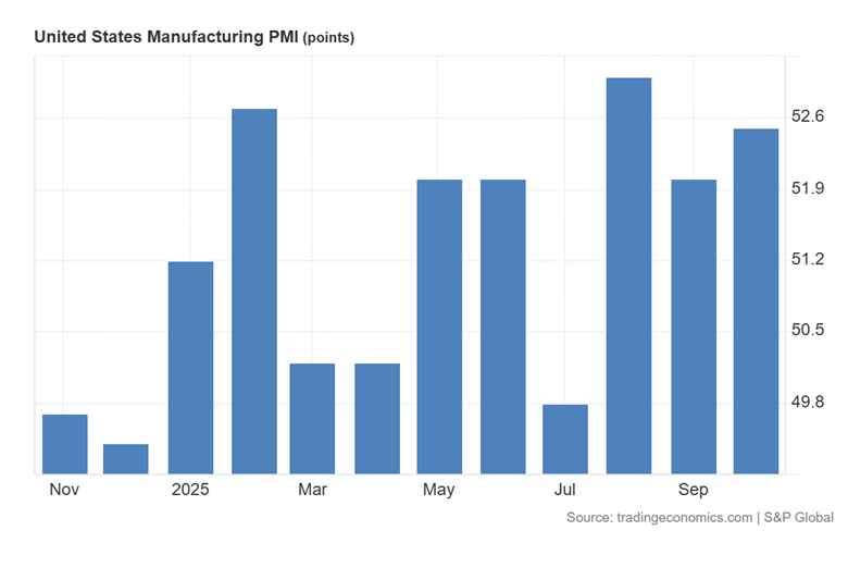 美国制造业PMI从9月的52点微升至10月的52.5点,略超52.2点的市场预期。