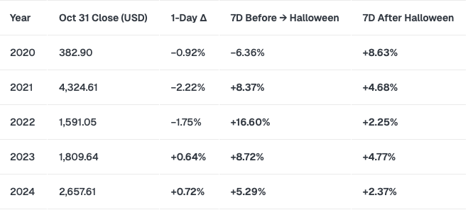 以太坊的万圣节表现虽不惊艳却异常稳健。2020至2024年间,ETH每年万圣节后七日回报率均为正值,平均涨幅约4.5%。这段时期常与短期市场复苏重合,暗示ETH可能成为季节性波动中的稳定剂。 本周SharpLink Gaming宣布计划在Consensys的Linea网络上部署2亿美元ETH,创下企业级DeFi投资新纪录。在ether.fi和Eigen Labs支持下,该计划旨在通过以太坊质押和去中心化应用获取机构级收益,揭示企业正将闲置加密资产悄然转入Layer-2网络