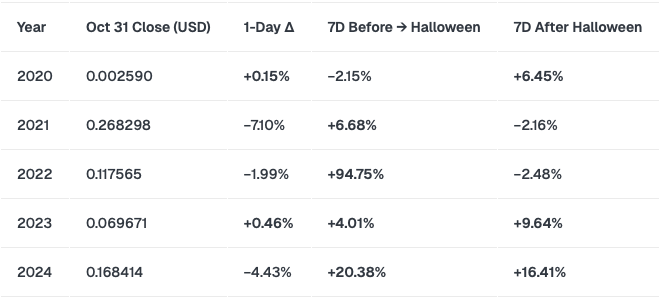 这五种山寨币历来在万圣节后一周表现积极,此阶段通常伴随着流动性复苏、投资组合调整和市场短期反弹。历史虽不能保证未来表现,但数据揭示的季节性规律不容忽视。在加密世界,即便过往涨势的"幽灵"也会留下痕迹,今年万圣节,那些熟悉的名字或将再次崭露头角