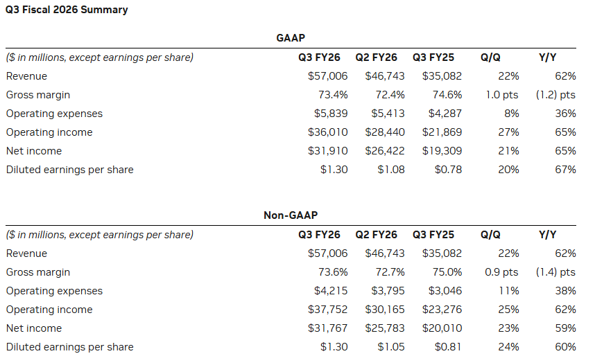 英伟达以570亿美元的收入粉碎了第三季度的预期,超过了华尔街547亿美元的预测,并缓解了对人工智能泡沫的担忧。该公司319亿美元的利润,同比增长65%,凸显了其在人工智能芯片市场的主导地位,而对下一季度650亿美元的乐观预测则增强了人们对持续增长的信心。