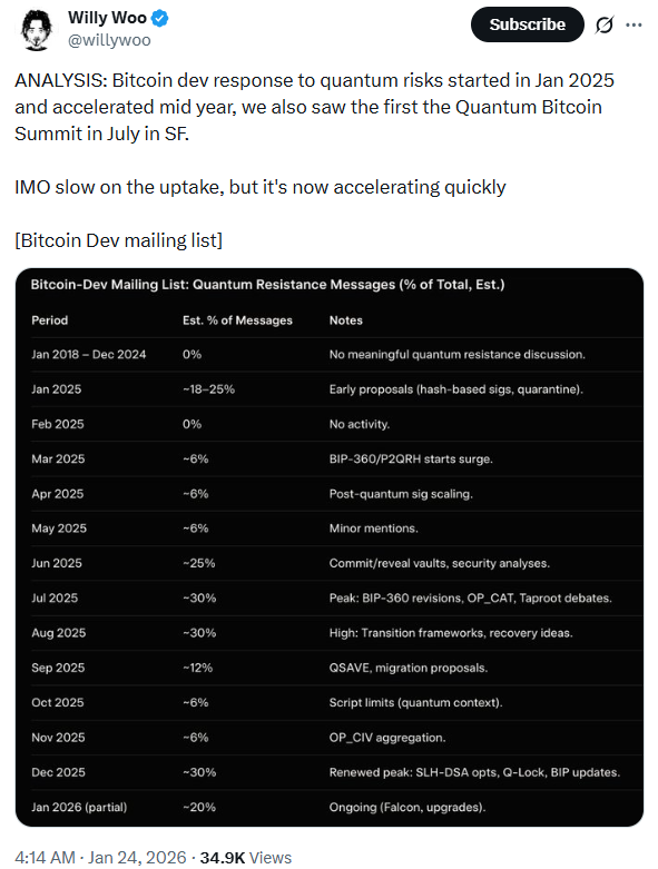 多年来,量子计算在比特币开发圈内几乎不被提及。从2018年到2024年底,比特币开发邮件列表几乎未见关于量子威胁的持续性讨论。然而,这一情况在2025年突然改变。根据Willy Woo发布的分析,一月份首次真正打破了这一模式。早期的讨论信息集中于基本构想,例如基于哈希的签名以及未来是否应隔离易受攻击的代币。